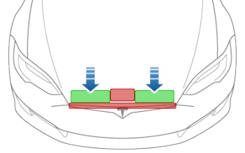 Come chiudere il bagagliaio anteriore: Se usiamo il bagagliaio anteriore, quando lo chiudiamo è molto importante non forzare la parte centrale, ma sui lati (vedi figura).